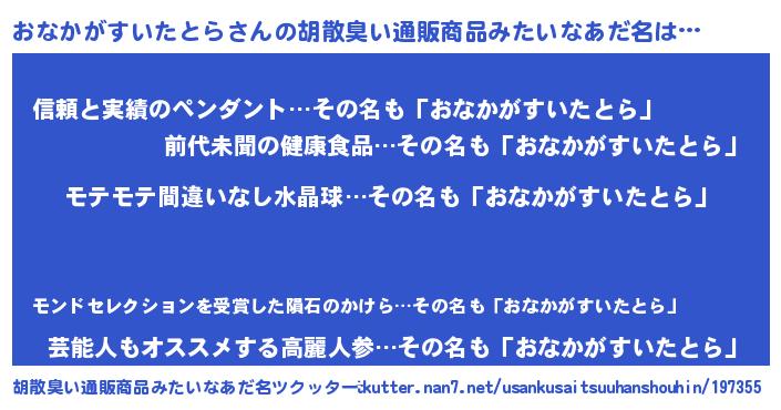 | ヒーロー風カッコイイあだ名 | 『スーパーオナカガスイタトラ』 |