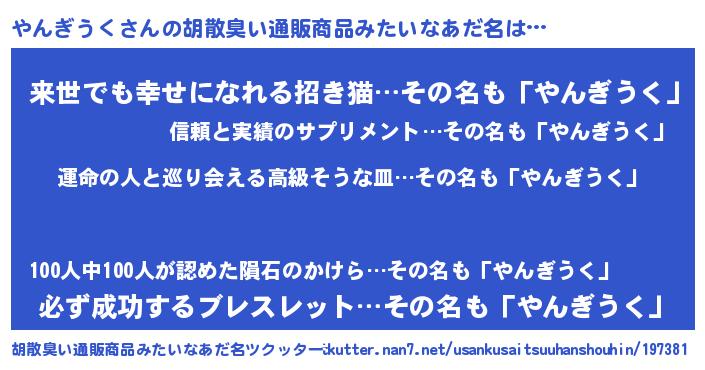 | 男性向けラノベタイトル風あだ名 | 『うちのやんぎうくが世界を掌握している!』 |