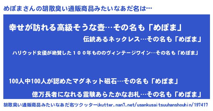 | ヒーロー風カッコイイあだ名 | 『仮面メポダー』『ウルトラめぽまマン』 |