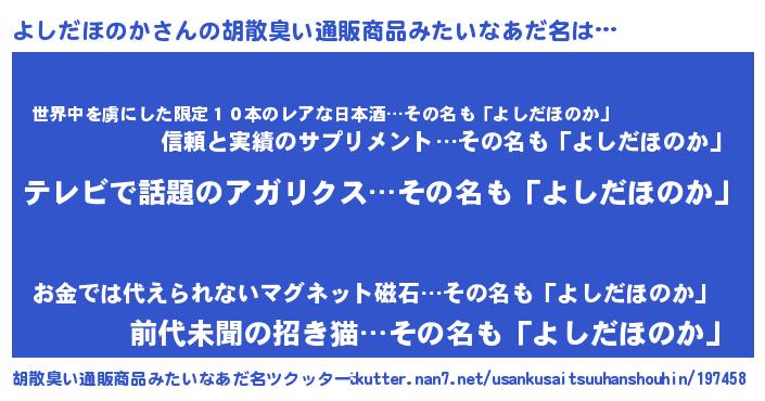 | ヘコむあだ名 | 『よしだほのか(爆)』『よし太郎』 |