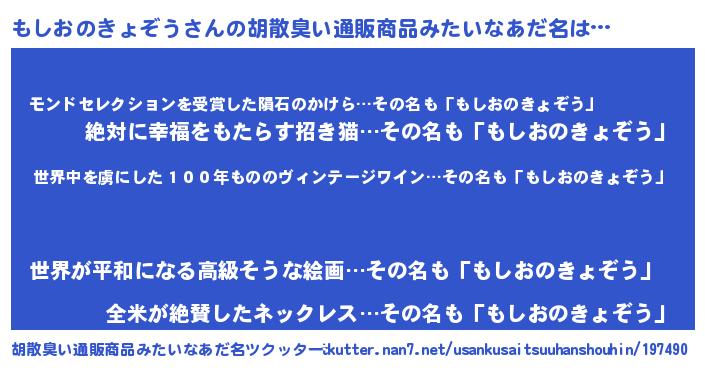 | 男性向けラノベタイトル風あだ名 | 『転生したらもしおのきょぞうだった件』 |