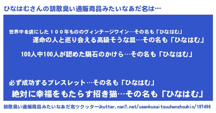 | 男性向けラノベタイトル風あだ名 | 『おまえをオタクにしてやるから、俺をひなはむにしてくれ! 』 |