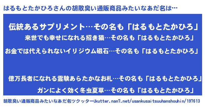 | 男性向けラノベタイトル風あだ名 | 『おまえをオタクにしてやるから、俺をはるもとたかひろにしてくれ! 』 |