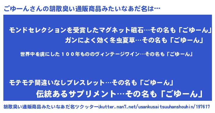 | 意味不明あだ名 | 『住所不定無職ごゆーん(11歳)』 |