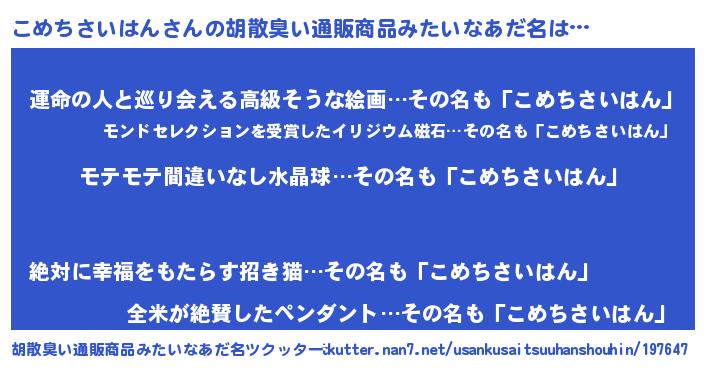 | 男性向けラノベタイトル風あだ名 | 『こめちさいはんに滅ぼされるだけの簡単なお仕事です』 |
