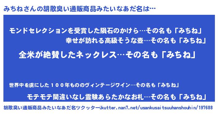 | 女子向けラノベタイトル風あだ名 | 『みちね様がみてる』『死神みちねの再婚』 |