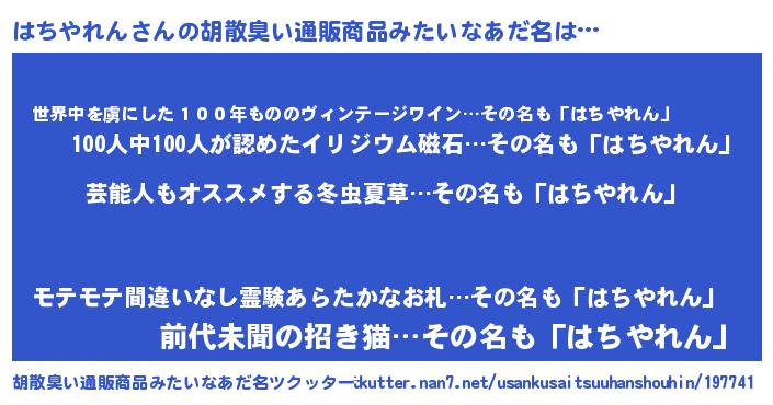 | 意味不明あだ名 | 『自称はちやれん』『永久保存はちやれん』 |
