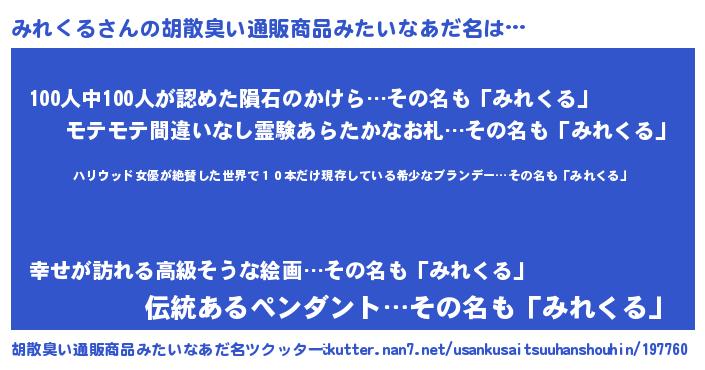 | 意味不明あだ名 | 『住所不定無職みれくる(85歳)』 |