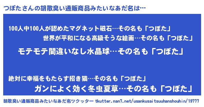 | 意味不明あだ名 | 『ペロリンつぼた』『自称つぼた』 |