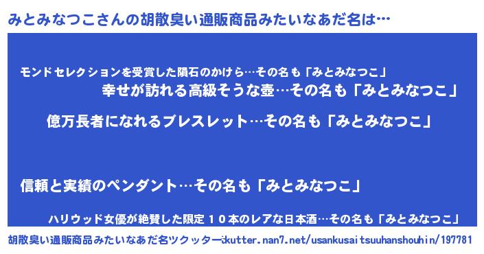 | 男性向けラノベタイトル風あだ名 | 『みとみなつこ~年齢イコール彼女いない歴の魔法使い~』 |