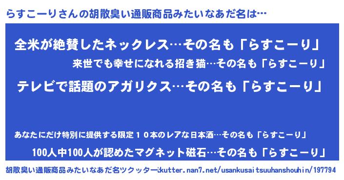 | ヘコむあだ名 | 『らす太郎』『らすこーり(爆)』 |