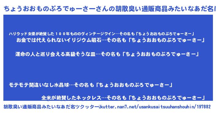 | 欧米人風あだ名 | 『ちょうおおものぷろでゅーさークリステル』 |