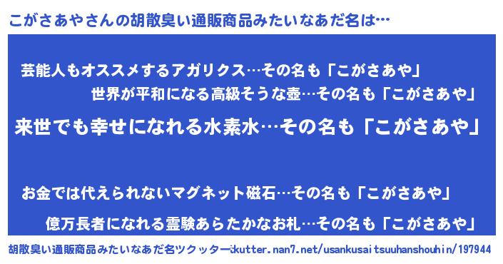 | 意味不明あだ名 | 『永久保存こがさあや』『自称こがさあや』 |