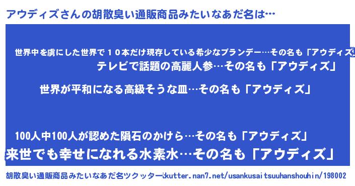 | 男性向けラノベタイトル風あだ名 | 『転生したらアウディズだった件』 |