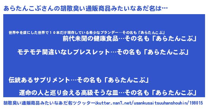 | 男性向けラノベタイトル風あだ名 | 『アラタンコブアートオンライン』 |