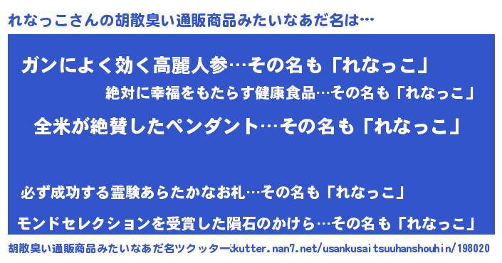 | 男性向けラノベタイトル風あだ名 | 『れなっこの嫁は女の子じゃないと思った?』 |