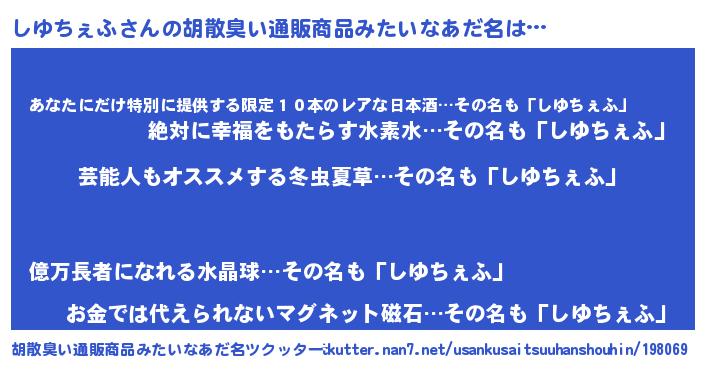 | ヘコむあだ名 | 『しゆちぇふ(遠い目)』『しゆふぇ~』 |
