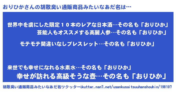 | 意味不明あだ名 | 『なめこ科おりひか属』『自称おりひか』 |