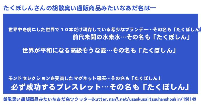 | 肩書あだ名 | 『たくぼしん大統領』『たくぼしん少尉』 |