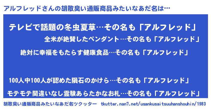 | 男性向けラノベタイトル風あだ名 | 『アルフレッドという概念が存在しない退屈な世界 』 |