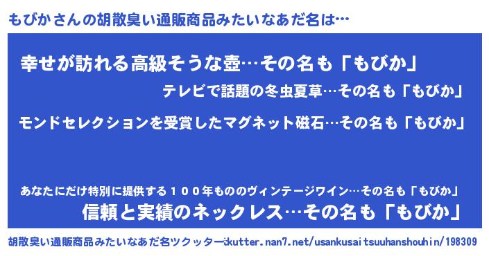 | 女子向けラノベタイトル風あだ名 | 『死神もびかの再婚』『もびか様がみてる』 |