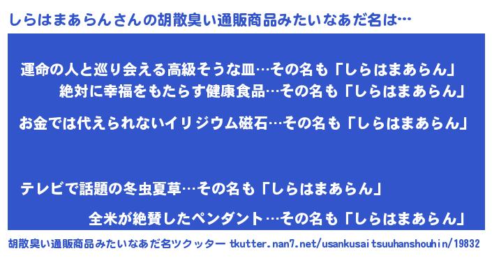 | 男性向けラノベタイトル風あだ名 | 『おまえをオタクにしてやるから、俺をしらはまあらんにしてくれ! 』 |