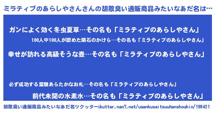 | 男性向けラノベタイトル風あだ名 | 『緋弾のミラティブノアラシヤサン』 |