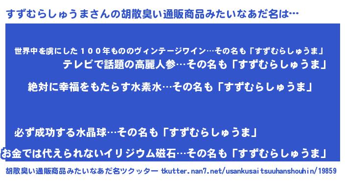 | ヘコむあだ名 | 『すずむらしゅうま(震え声)』『すずにゅー』 |