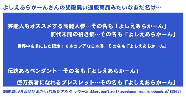 | 意味不明あだ名 | 『住所不定無職よしえあらかーん(43歳)』 |