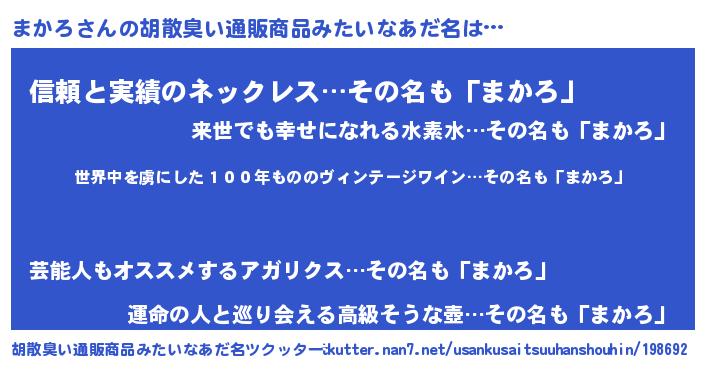 | 男性向けラノベタイトル風あだ名 | 『この素晴らしい世界にまかろを!』 |