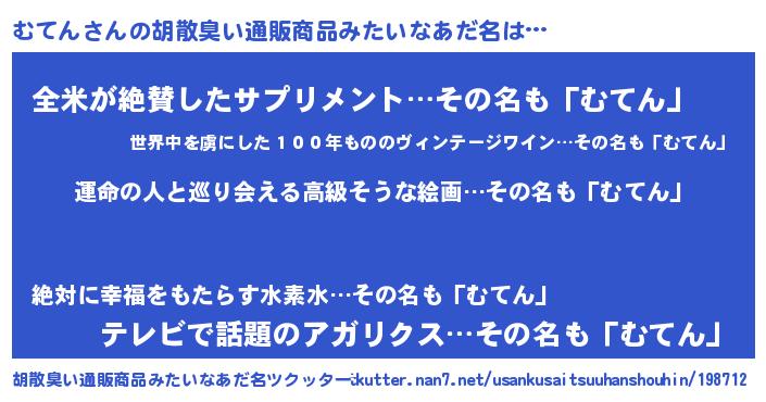 | 男性向けラノベタイトル風あだ名 | 『うちのむてんが世界を掌握している!』 |