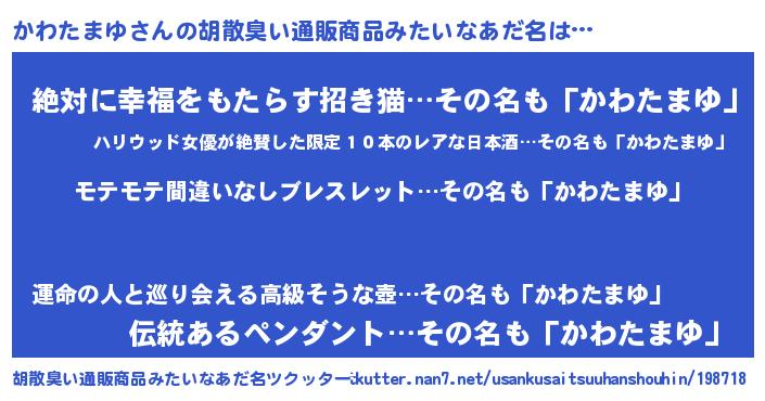 | ヘコむあだ名 | 『かわにー』『かわたまゆ(小並感)』 |