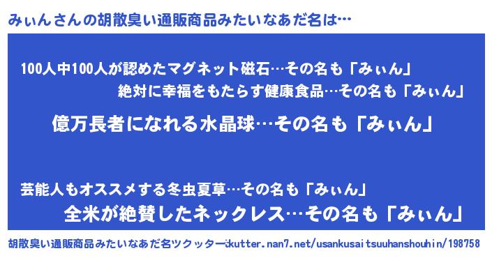 | 意味不明あだ名 | 『ペロリンみぃん』『ヨモギ科みぃん属』 |