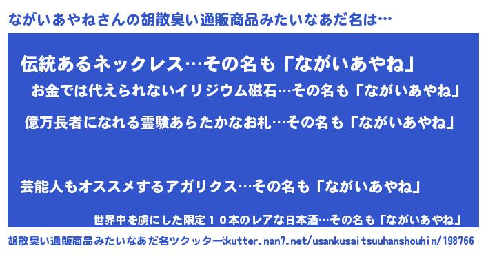 | 恥ずかしいあだ名 | 『プリティーながいあやね』『ながっちょ』 |