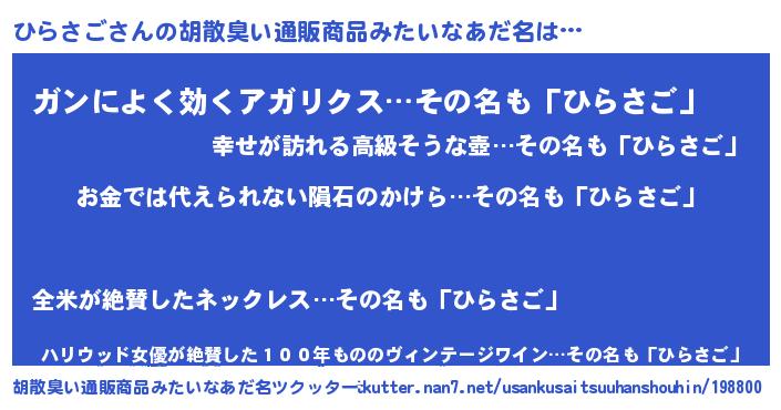 | 男性向けラノベタイトル風あだ名 | 『おまえをオタクにしてやるから、俺をひらさごにしてくれ! 』 |