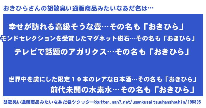 | 意味不明あだ名 | 『自称おきひら』『エリンギ科おきひら属』 |