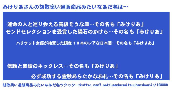 | 意味不明あだ名 | 『住所不定無職みけりあ(47歳)』 |