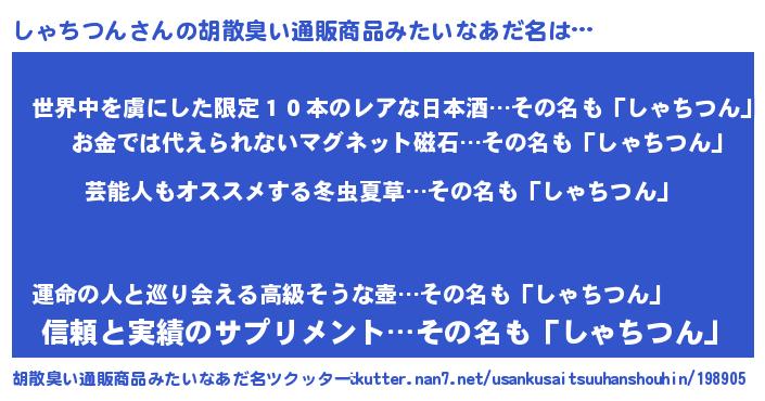| 男性向けラノベタイトル風あだ名 | 『Re:しゃちつんから始める異世界生活』 |