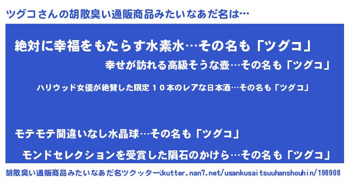 | 意味不明あだ名 | 『住所不定無職ツグコ(56歳)』 |