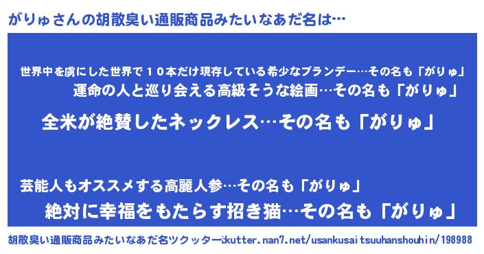 | 男性向けラノベタイトル風あだ名 | 『がりゅの嫁は女の子じゃないと思った?』 |