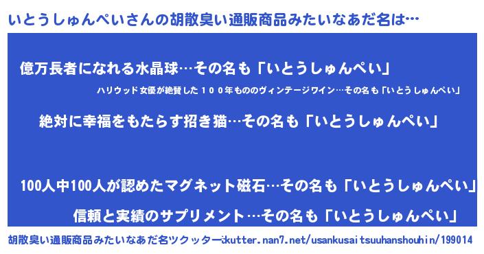 | ヘコむあだ名 | 『いとうしゅんぺい(笑)』『いとにゅー』 |