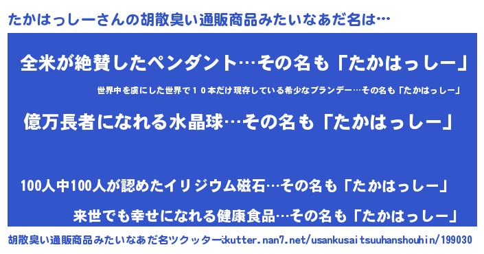 | 男性向けラノベタイトル風あだ名 | 『タカハッシーアートオンライン』 |