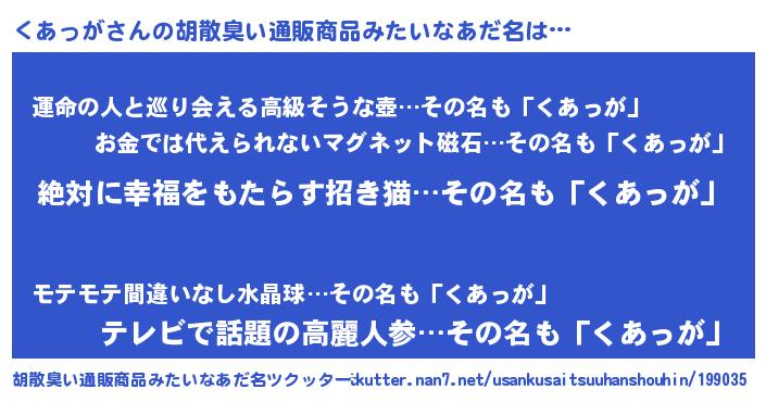 | 男性向けラノベタイトル風あだ名 | 『くあっがという概念が存在しない退屈な世界 』 |