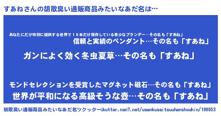 | 男性向けラノベタイトル風あだ名 | 『スアネスレイヤー』『緋弾のスアネ』 |