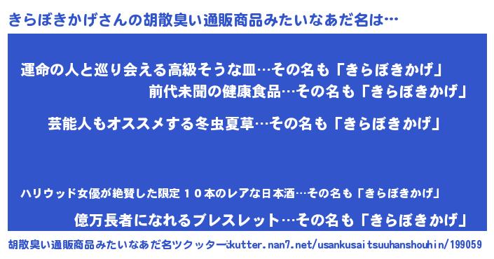 | 男性向けラノベタイトル風あだ名 | 『Re:きらぼきかげから始める異世界生活』 |