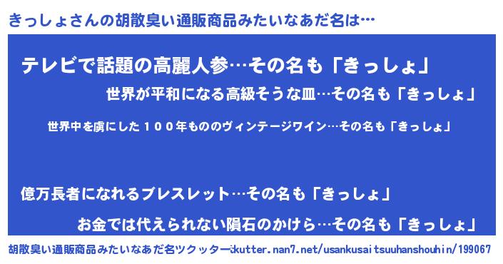 | 男性向けラノベタイトル風あだ名 | 『この素晴らしい世界にきっしょを!』 |