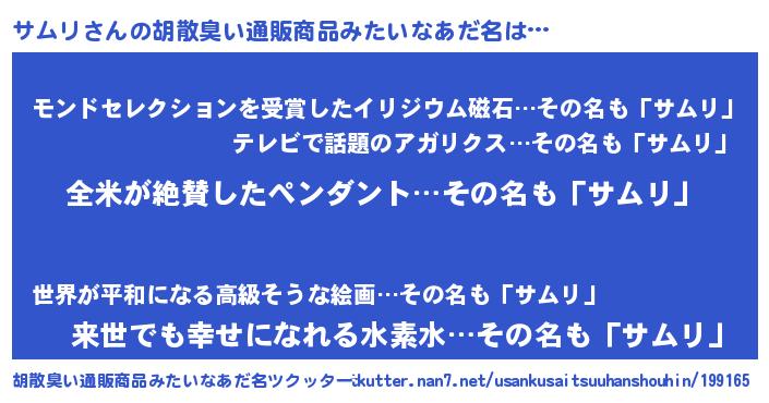 | ヒーロー風カッコイイあだ名 | 『幻影騎士サム』『慈愛の使者サムリ』 |