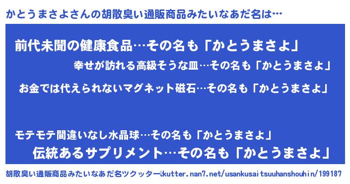 | 男性向けラノベタイトル風あだ名 | 『ノーゲーム・ノーカトウマサヨ』 |