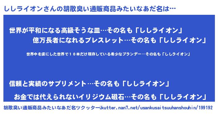| 意味不明あだ名 | 『住所不定無職ししライオン(86歳)』 |
