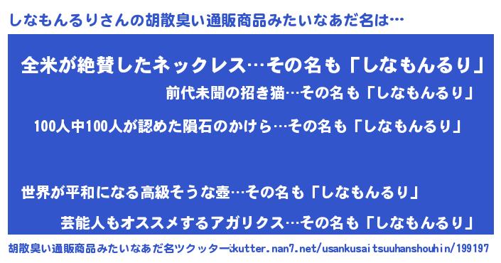 | ヘコむあだ名 | 『しなぷりん』『しなもんるり(苦笑)』 |
